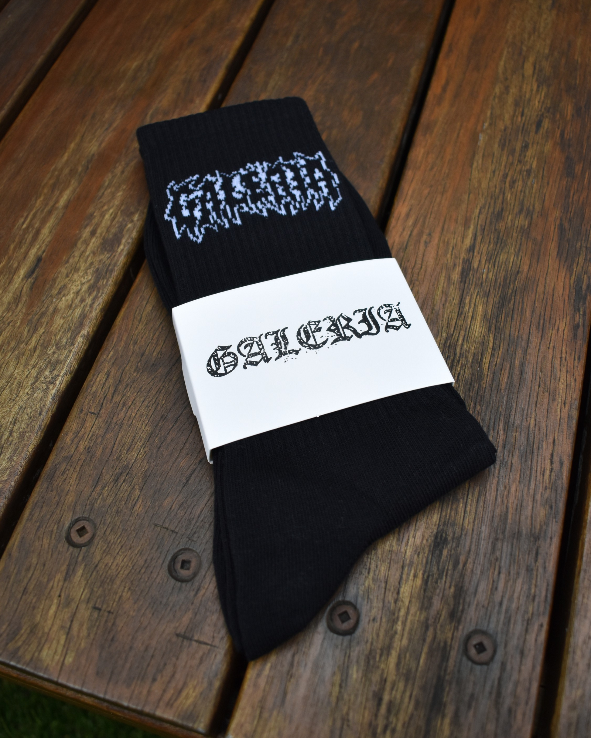 Step up your streetwear game with the Galería Crew Socks, where comfort meets edge. These high-quality white ribbed socks feature a bold, distorted Galería logo in white designed to make a statement whether you're rocking sneakers or slides.